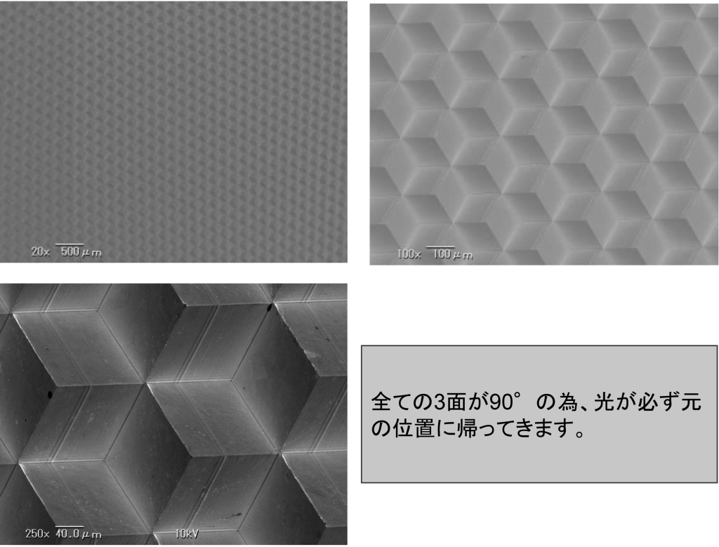 全ての面の角度が90°のため、光が必ず元の位置に帰ってきます。