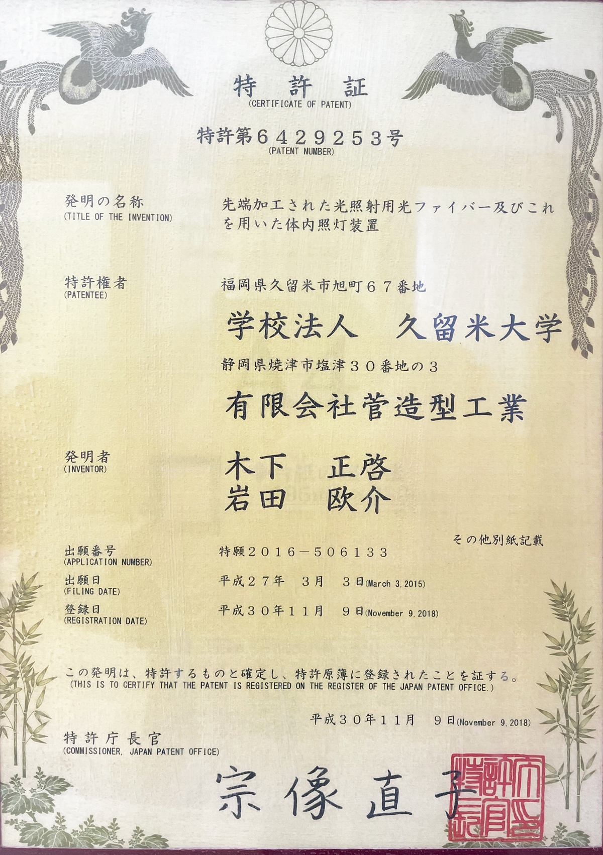 - 先端加工された光照射用光ファイバー及びこれを用いた体内照灯装置(特許第6429253号)